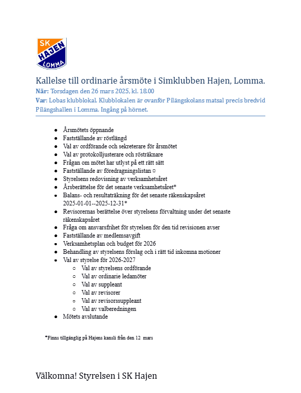 Årsmöte 2026 2026-03-11 Robin Daremo Nyheter Den 26 mars kl 18.00 ses vi i Lobas klubblokal, ovanför Pilängsskolans matsal, precis bredvid badet.